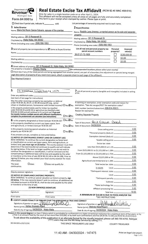 | 2 | 04/30/2024 | QCD | QUIT CLAIM DEED | CALVARIO MARIA DEL ROCIO GARCIA | LARA-JIMENEZ RODOLFO | | | | 147475 | 2024-02207 |