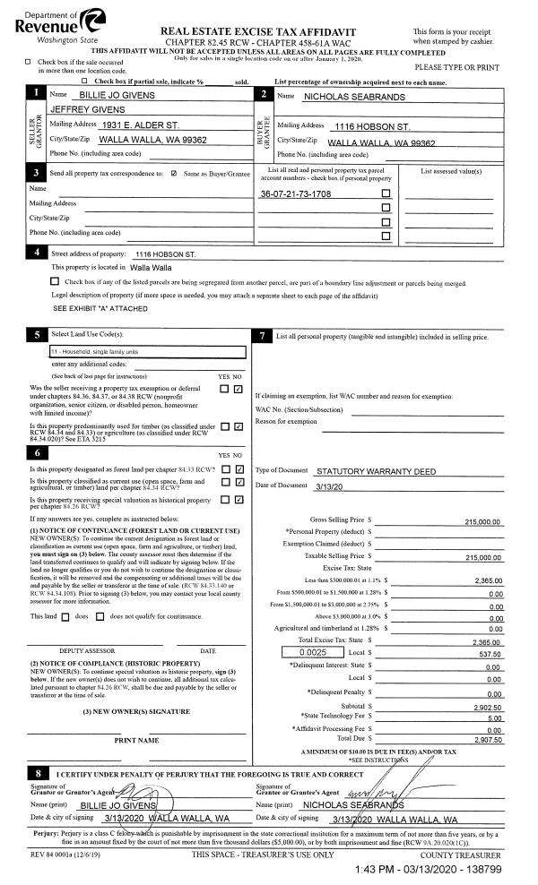 | 1 | 03/13/2020 | SWD | STATUTORY WARRANTY DEED | GIVENS JEFFREY & BILLIE JO | SEABRANDS NICHOLAS | | | $215,000.00 | 138799 | 2020-02336 |