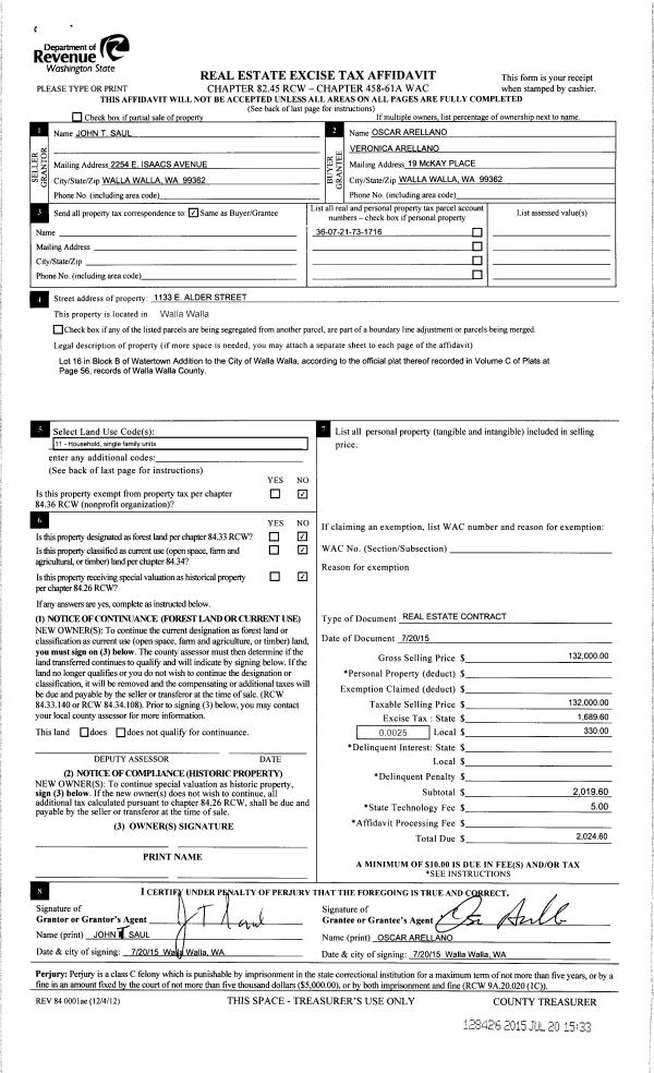 | 5 | 07/20/2015 | REAL ESTAT | REAL ESTATE CONTRACT | SAUL JOHN T | ARELLANO OSCAR & VERONICA | | | $132,000.00 | 128426 | 2015-06169 |