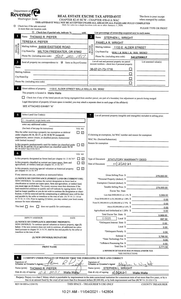 | 1 | 11/04/2021 | SWD | STATUTORY WARRANTY DEED | PIEFER THOMAS R & TERESA K | WRIGHT STEPHEN L & PAMELA R | | | $279,000.00 | 142804 | 2021-13243 |