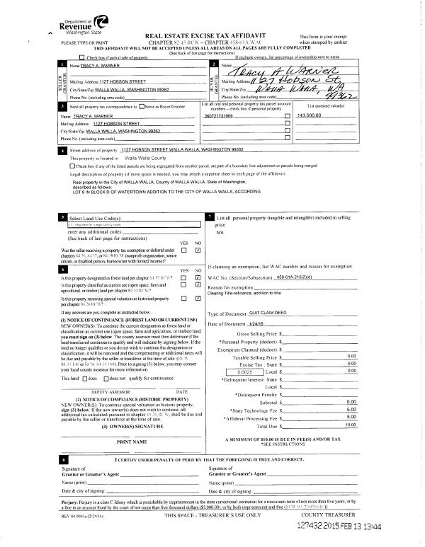 | 2 | 01/23/2015 | QCD | QUIT CLAIM DEED | SMITH TRACY A | WARNER JOHN P & TRACY A | | | $0.00 | 127432 | 2015-01375 |