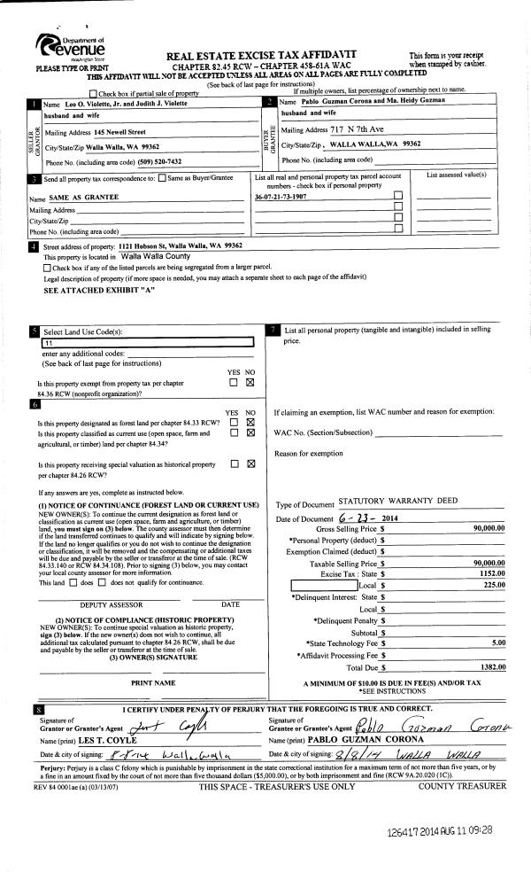 | 2 | 08/11/2014 | SWD | STATUTORY WARRANTY DEED | VIOLETTE LEO O & JUDITH J | CORONA PABLO GUZMAN & MA HEIDY | | | $90,000.00 | 126417 | 2014-05703 |
