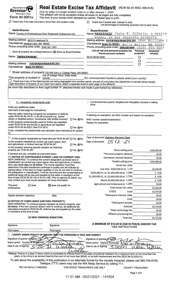 | 3 | 05/21/2021 | SWD | STATUTORY WARRANTY DEED | WINDEMUTH TIMOTHY M & CHERI | DIDARIO JAYNE E | | | $295,000.00 | 141604 | 2021-06176 |