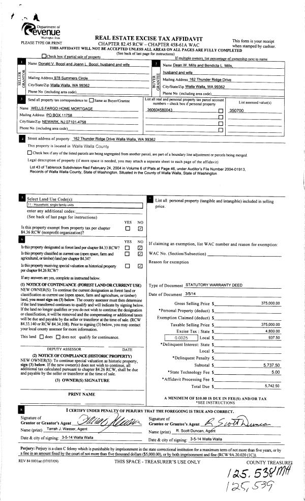 | 1 | 03/10/2014 | SWD | STATUTORY WARRANTY DEED | BOCOL DONALD V & JOANN L | MILLS DEAN W & BENDICTA L | | | $375,000.00 | 125539 | 2014-01629 |
