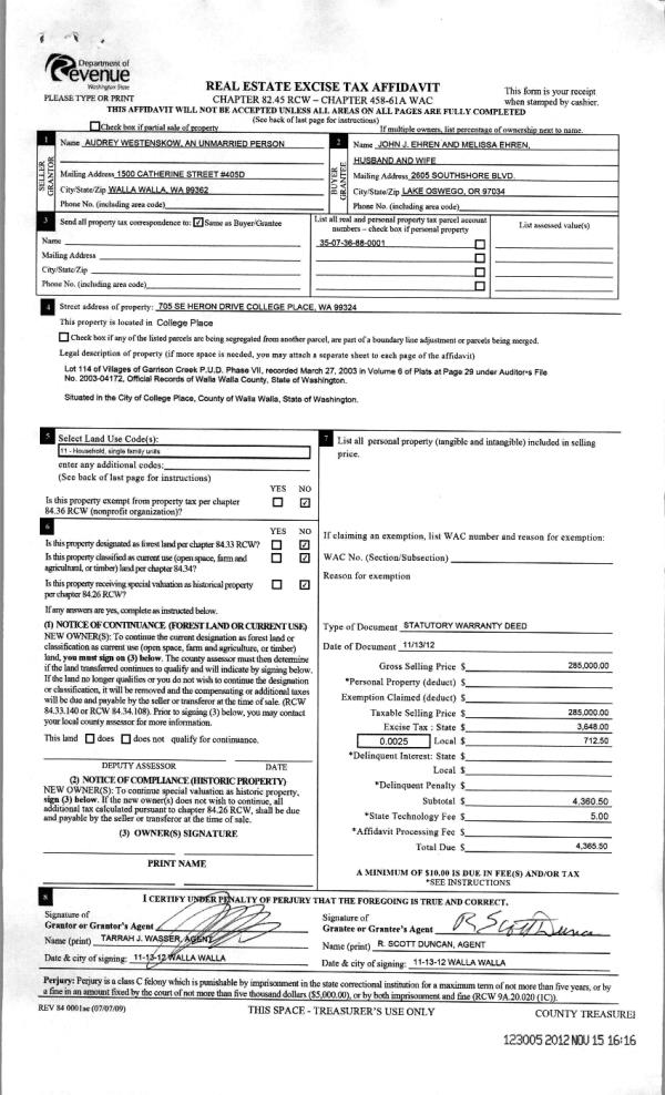 | 5 | 11/15/2012 | WARRANTY D | WARRANTY DEED | WESTENSKOW, AUDREY | EHREN, JOHN J & MELISSA | | | $285,000.00 | 123005 | 2012-10100 |