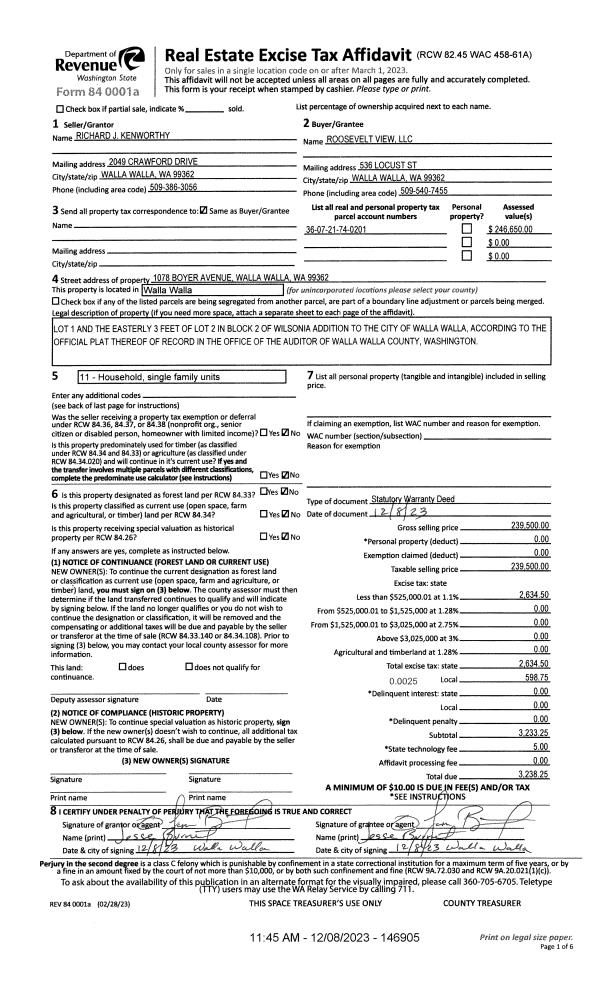 | 1 | 12/08/2023 | SWD | STATUTORY WARRANTY DEED | KENWORTHY RICHARD J | ROOSEVELT VIEW LLC | | | $239,500.00 | 146905 | 2023-07096 |