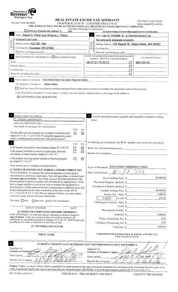 | 3 | 10/28/2019 | SWD | STATUTORY WARRANTY DEED | PITZER DAVID G & SHARON L | VIOLETTE LEO O JR | | | $85,000.00 | 137968 | 2019-08754 |