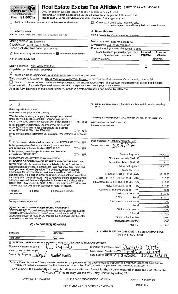 | 1 | 03/17/2022 | SWD | STATUTORY WARRANTY DEED | WRIGHT JOSHUA | WITT ANGELA KAY | | | $287,000.00 | 143570 | 2022-02248 |