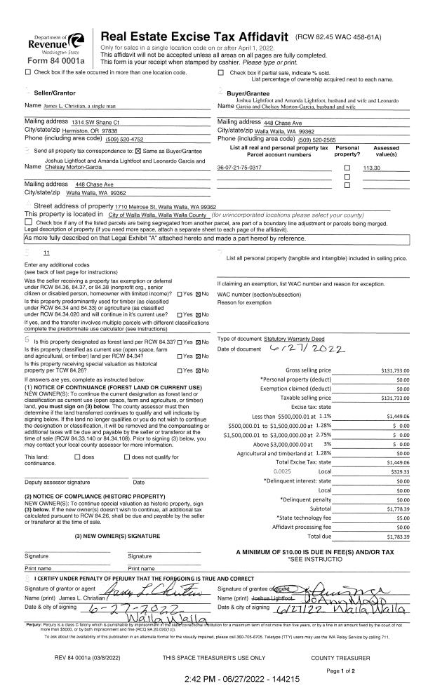 | 2 | 06/27/2022 | SWD | STATUTORY WARRANTY DEED | CHRISTIAN JAMES L | LIGHTFOOT JOSHUA & AMANDA | | | $131,733.00 | 144215 | 2022-05407 |