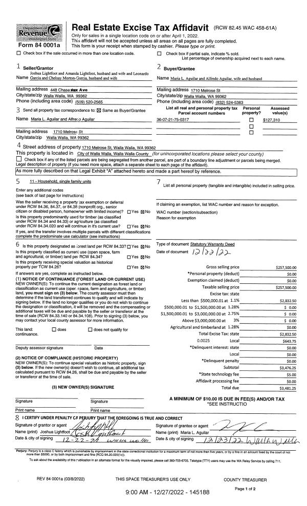 | 1 | 12/27/2022 | SWD | STATUTORY WARRANTY DEED | LIGHTFOOT JOSHUA & AMANDA | AGUILAR MARIE LUZ & ALFREDO | | | $257,500.00 | 145188 | 2022-09905 |