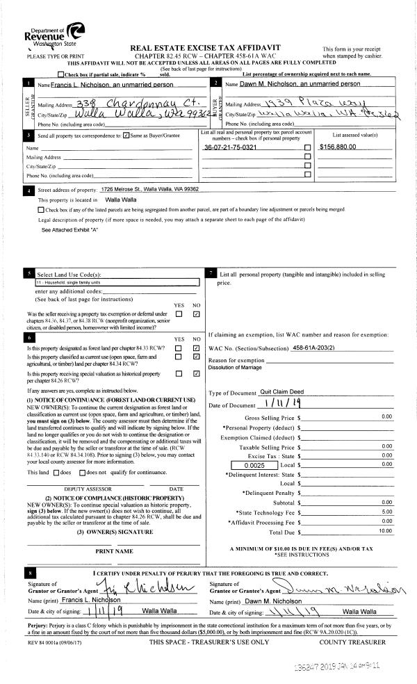 | 4 | 01/11/2019 | QCD | QUIT CLAIM DEED | NICHOLSON FRANCIS L | NICHOLSON DAWN M | | | $0.00 | 136247 | 2019-00262 |