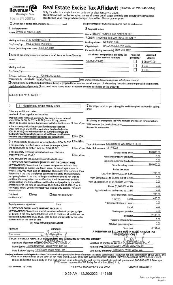 | 3 | 12/20/2022 | SWD | STATUTORY WARRANTY DEED | NICHOLSON DAWN M | THONNEY BRIAN & KIM PAYETTE | | | $160,000.00 | 145158 | 2022-09790 |