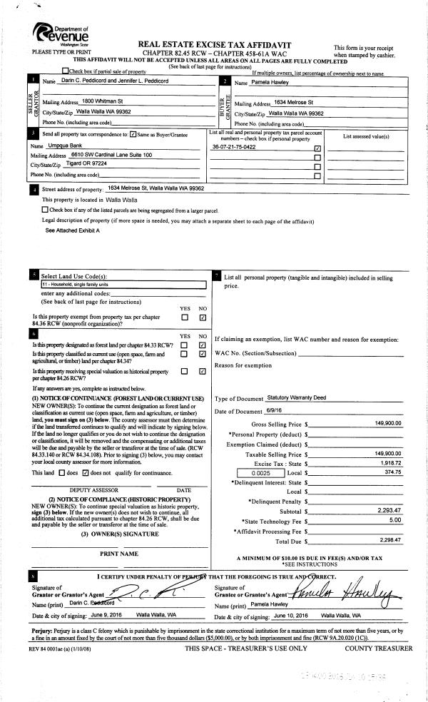 | 3 | 06/10/2016 | SWD | STATUTORY WARRANTY DEED | PEDDICORD DARIN C & JENNIFER L | HAWLEY PAMELA | | | $149,900.00 | 130400 | 2016-04406 |