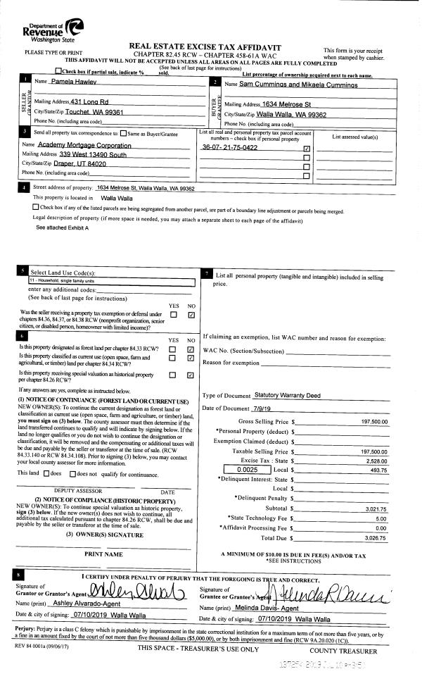 | 2 | 07/10/2019 | SWD | STATUTORY WARRANTY DEED | HAWLEY PAMELA | CUMMINGS SAM & MIKAELA | | | $197,500.00 | 137254 | 2019-04930 |