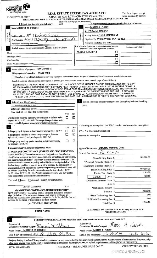 | 2 | 02/15/2019 | SWD | STATUTORY WARRANTY DEED | HOUSE MARINA R | CASE MARC A | | | $169,000.00 | 136392 | 2019-00990 |