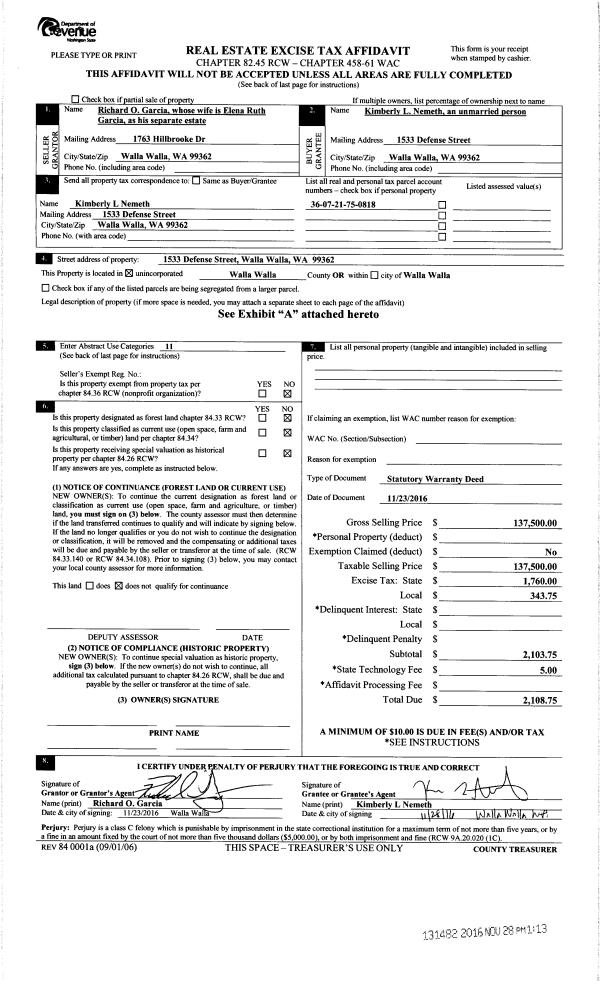 | 2 | 11/28/2016 | SWD | STATUTORY WARRANTY DEED | GARCIA RICHARD O | NEMETH KIMBERLY L | | | $137,500.00 | 131482 | 2016-09701 |