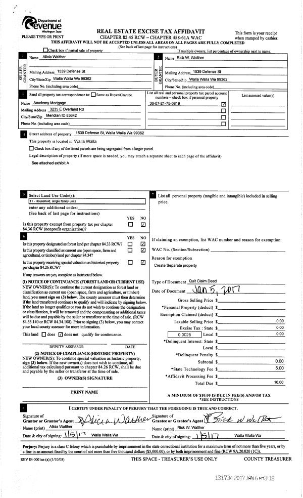 | 1 | 01/06/2017 | QCD | QUIT CLAIM DEED | WALTHER ALICIA | WALTHER RICK W | | | | 131734 | 2017-00176 |