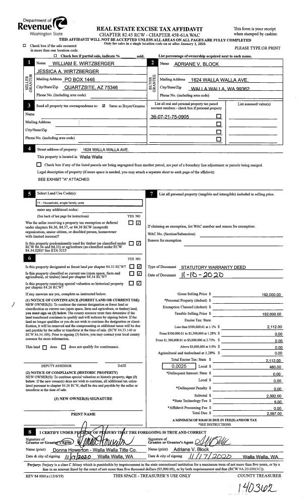| 2 | 11/17/2020 | SWD | STATUTORY WARRANTY DEED | WIRTZBERGER WILLIAM E | BLOCK ADRIANE V | | | $192,000.00 | 140362 | 2020-12159 |