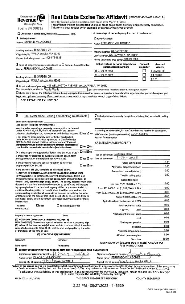| 1 | 09/27/2023 | QCD | QUIT CLAIM DEED | VILLAGOMEZ FERNANDO | VILLAGOMEZ FERNANDO | | | | 146539 | 2023-05664 |