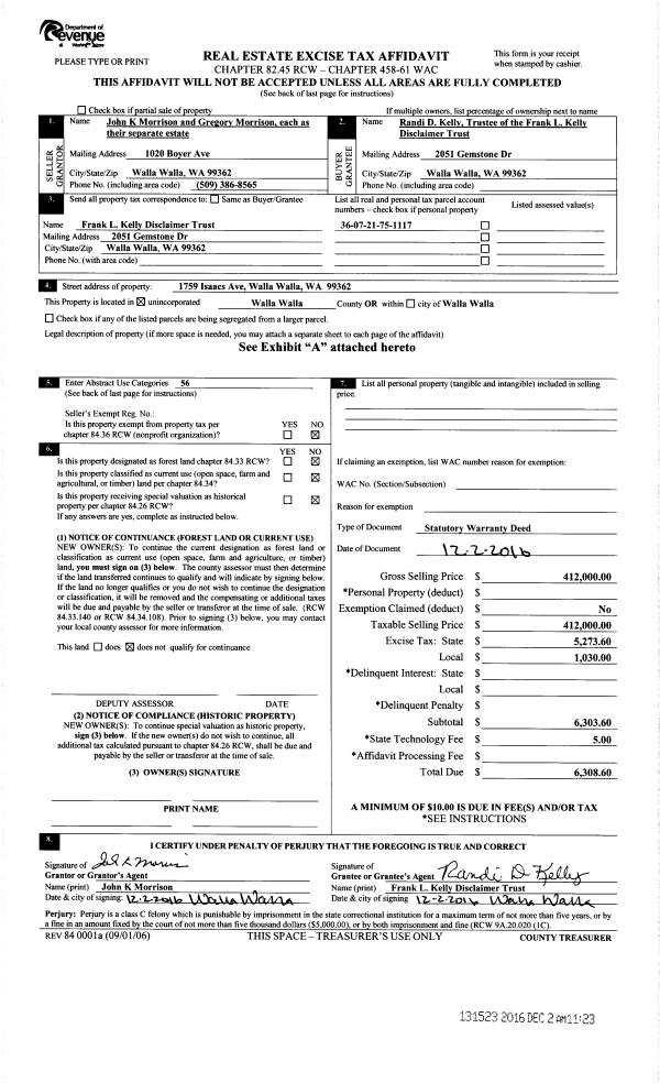 | 2 | 12/02/2016 | SWD | STATUTORY WARRANTY DEED | MORRISON JOHN K | FRANK L KELLY DISCLAIMER TRUST | | | $412,000.00 | 131523 | 2016-09856 |