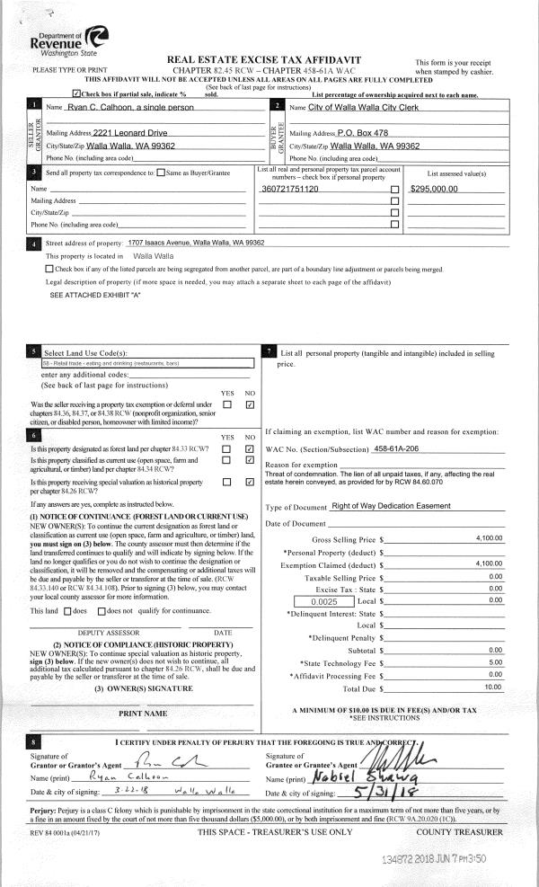 | 1 | 06/07/2018 | EASE | EASEMENT | CALHOON RYAN C | CITY OF WALLA WALLA CITY CLERK | | | $4,100.00 | 134872 | 2018-04568 |