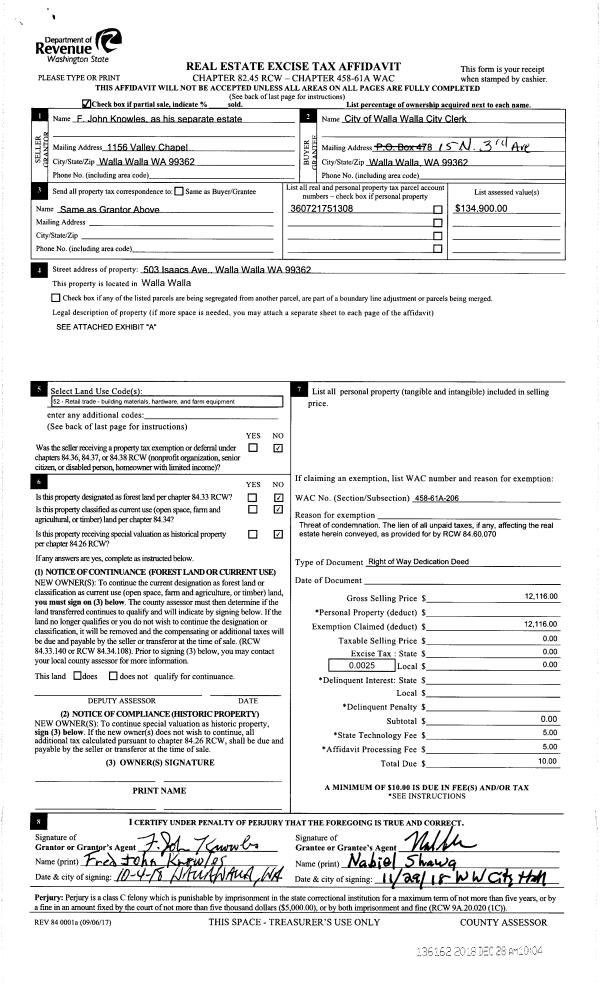 | 3 | 12/28/2018 | EASE | EASEMENT | KNOWLES F JOHN ESTATE OF | WALLA WALLA CITY OF | | | $12,116.00 | 136162 | 2018-10653 |