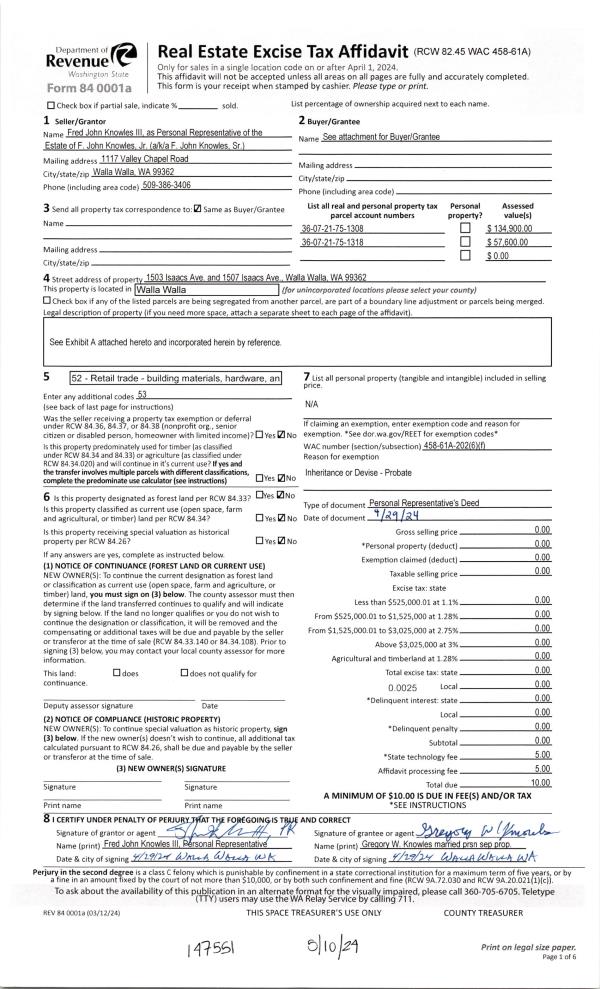 | 1 | 05/10/2024 | DPR | DEED OF PERSONAL REPRESENTATIVE | KNOWLES F JOHN ESTATE OF | KNOWLES GREGORY WAYNE | | | | 147551 | 2024-02518 |