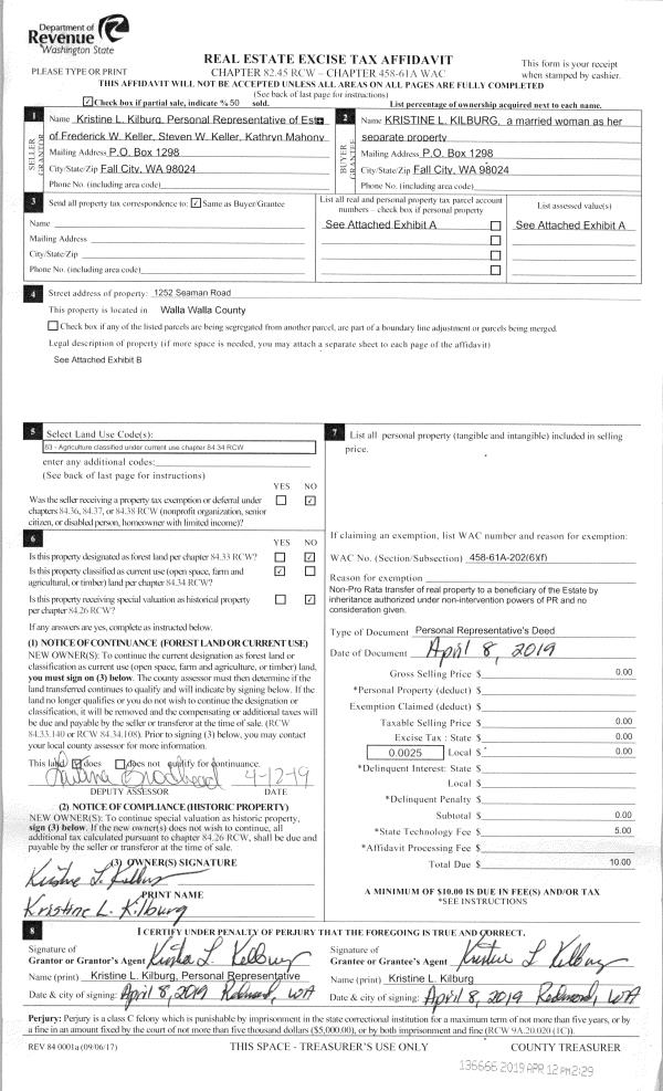 | 2 | 04/25/2019 | DPR | DEED OF PERSONAL REPRESENTATIVE | KELLER FREDERICK W ESTATE & KK4 FARMS LLC | KILBURG KRISTINE L 50% | 8 PARCELS | | $0.00 | 136760 | 2019-02676 |