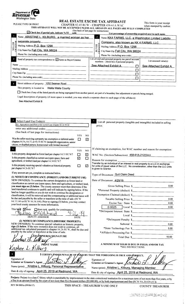 | 1 | 04/25/2019 | QCD | QUIT CLAIM DEED | KILBURG KRISTINE L 50% | KK 4 FARMS LLC | 8 PARCELS | | $0.00 | 136765 | 2019-02679 |