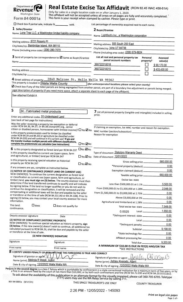 | 1 | 12/05/2022 | SWD | STATUTORY WARRANTY DEED | LONE TREE LLC | LIGHTFOOT'S INC | | 2-PARCELS | $660,000.00 | 145093 | 2022-09495 |