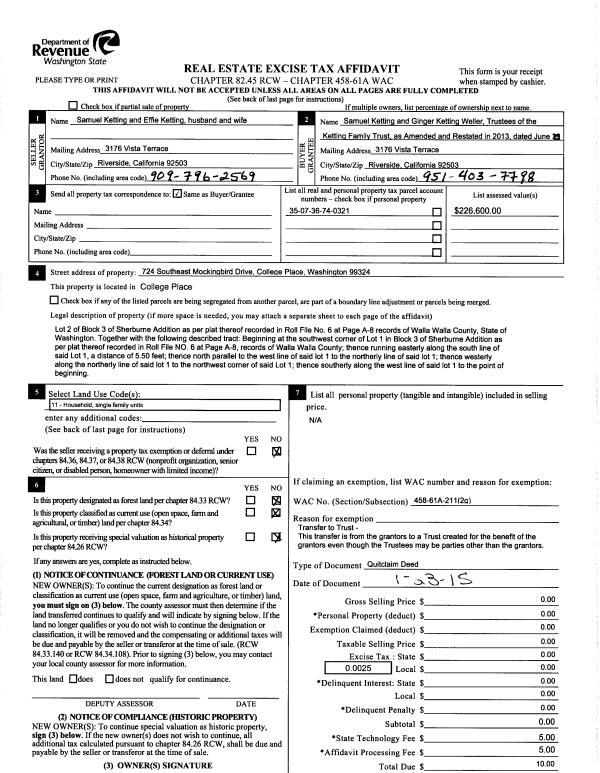 | Mailing Address: | 724 SE MOCKINGBIRD DR COLLEGE PLACE, WA 99324 | % Ownership: | 100.0000000000% |