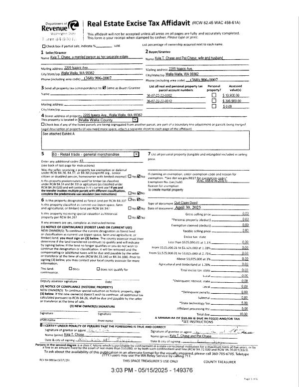 | 1 | 05/29/2025 | QCD | QUIT CLAIM DEED | CHASE KYLA T & PAT | SILA PROPERTIES LLC | | | | 149456 | 2025-03007 |