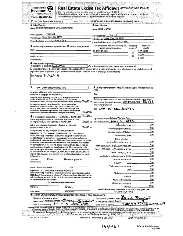 | 3 | 08/05/2022 | SWD | STATUTORY WARRANTY DEED | REINHARDT NORMAN | BRYANT LAURA L | | | $0.00 | 144451 | 2022-06575 |