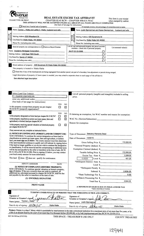 | 1 | 12/31/2015 | SWD | STATUTORY WARRANTY DEED | WATTS TYRONE L | BANNERMAN JUSTIN & KAREN | | | $172,500.00 | 129441 | 2015-11195 |