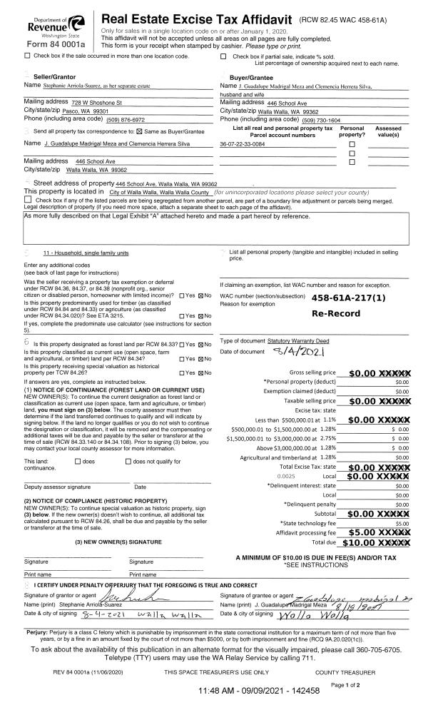 | 1 | 09/09/2021 | SWD | STATUTORY WARRANTY DEED | ARRIOLA-SUAREZ STEPHANIE | MEZA J GUADALUPE MADRIGAL | | | | 142458 | 2021-11093 |