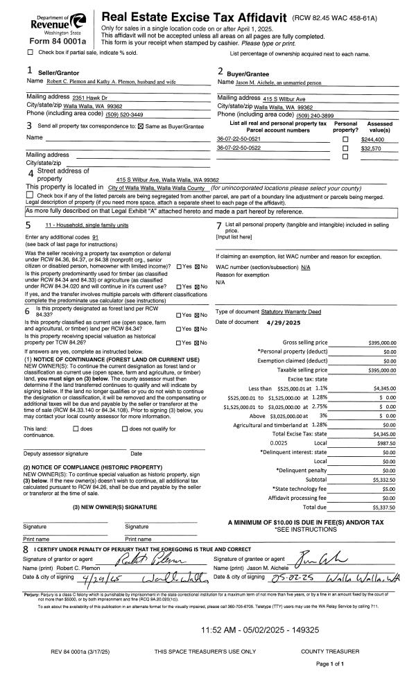 | Mailing Address: | 415 S WILBUR AVE WALLA WALLA, WA 99362 | % Ownership: | 100.0000000000% |