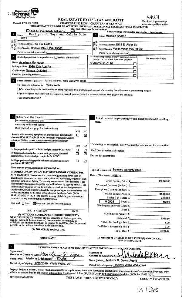 | 2 | 08/26/2019 | SWD | STATUTORY WARRANTY DEED | JOHNSON MARILYN J | SHARPE MELISSIA | | | $185,000.00 | 137562 | 2019-06584 |