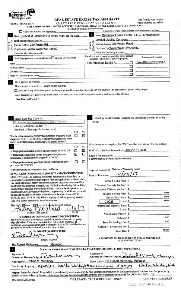 | 1 | 03/28/2017 | SWD | STATUTORY WARRANTY DEED | MC KINNEY ROBERT M | MC KINNEY FAMILY FARMS LLC | | | $0.00 | 132180 | 2017-02692 |