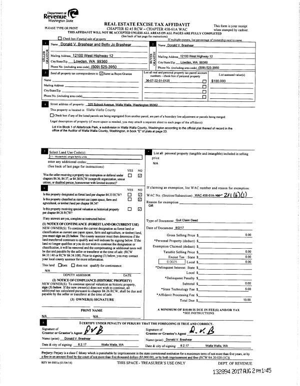 | 2 | 08/02/2017 | QCD | QUIT CLAIM DEED | BRASHEAR BETTY JO | BRASHEAR DONALD V | | | $0.00 | 132894 | 2017-05892 |