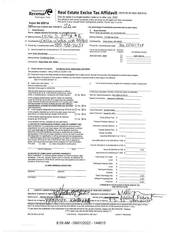 | 1 | 08/23/2022 | QCD | QUIT CLAIM DEED | STRUCKMEIER BRIAN & HEATHER M | STRUCKMEIER BRIAN | | | $0.00 | 144615 | 2022-07354 |