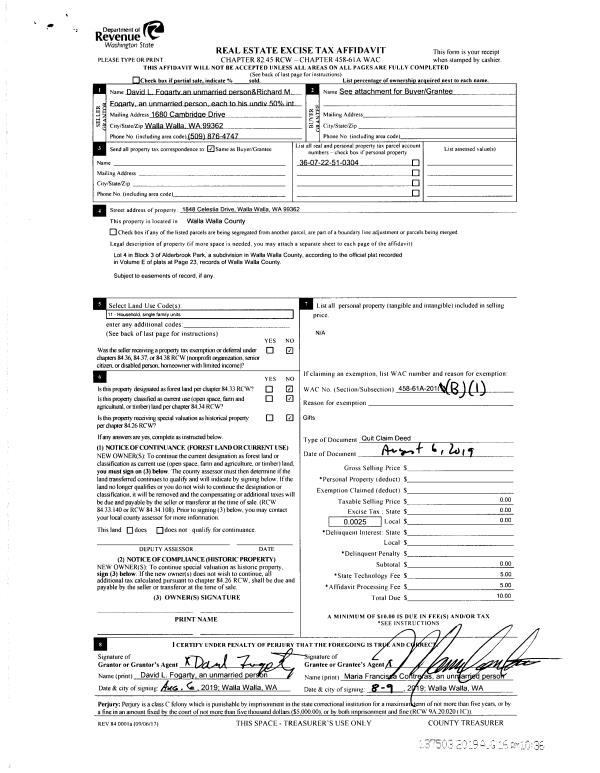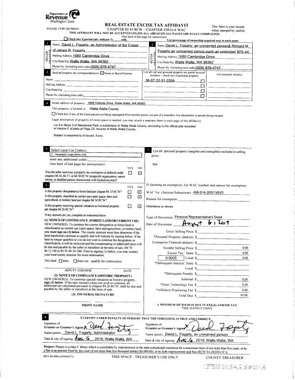 | 3 | 08/06/2019 | DPR | DEED OF PERSONAL REPRESENTATIVE | FOGARTY JAMES R | FOGARTY DAVID L | | | $0.00 | 137502 | 2019-06181 |