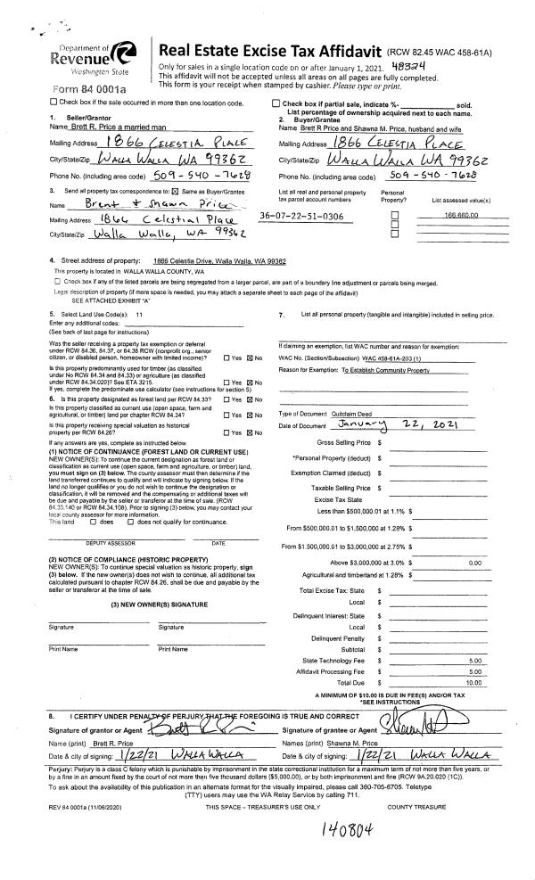 | 1 | 01/22/2021 | QCD | QUIT CLAIM DEED | PRICE BRETT R | PRICE BRETT R & SHAWNA M | | | $0.00 | 140804 | 2021-01013 |