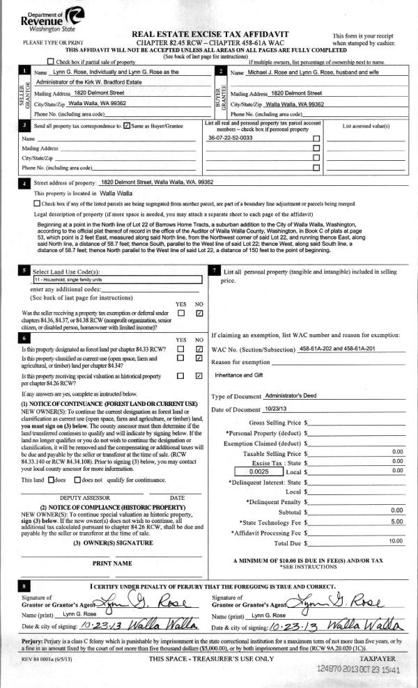| 5 | 10/23/2013 | WARRANTY D | WARRANTY DEED | BRADFORD, KIRK W ESTATE OF | ROSE, MICHAEL J & LYNN G | | | $0.00 | 124870 | 2013-10658 |