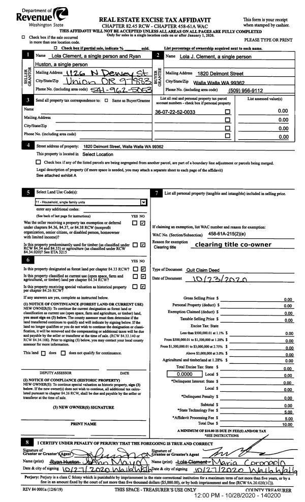 | 2 | 10/28/2020 | QCD | QUIT CLAIM DEED | CLEMENT LOLA | CLEMENT LOLA J | | | | 140200 | 2020-11247 |