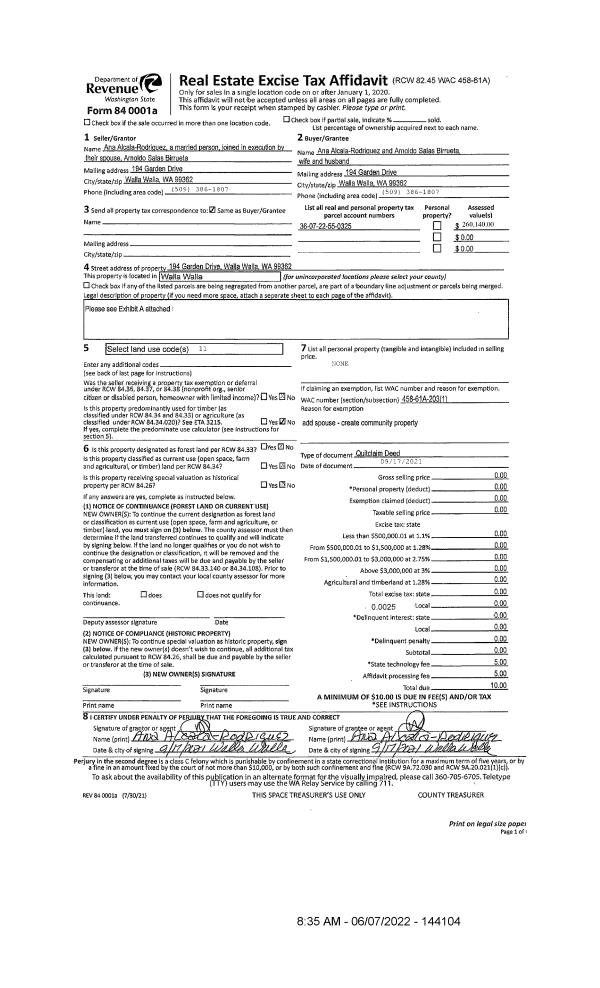 | 1 | 06/07/2022 | QCD | QUIT CLAIM DEED | RODRIGUEZ ANA ALCALA | ALCALA-RODRIGUEZ ANA & ARNOLDO SALAS BIRRUETA | | | $0.00 | 144104 | 2022-04858 |