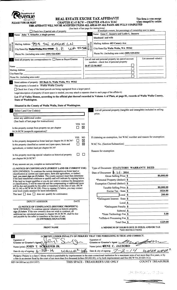 | 1 | 07/03/2014 | SWD | STATUTORY WARRANTY DEED | SCHAEFER JOHN T JR | JAUSORO GENE C & LESLIE L | | | $80,000.00 | 126199 | 2014-04645 |