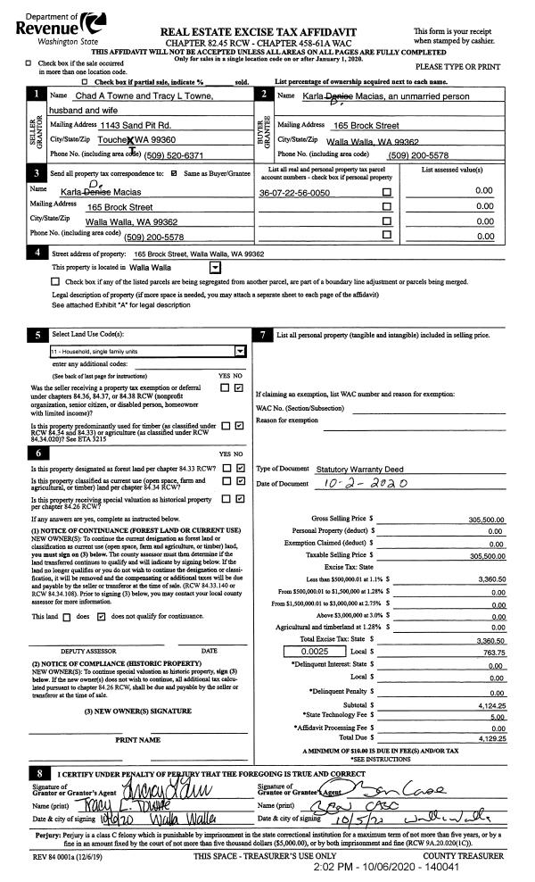 | 1 | 10/06/2020 | SWD | STATUTORY WARRANTY DEED | TOWNE CHAD A & TRACY L | MACIAS KARLA D | | | $305,500.00 | 140041 | 2020-10318 |