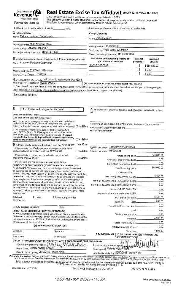 | 1 | 05/12/2023 | SWD | STATUTORY WARRANTY DEED | HARRIS MATHEW & DARBY | MALONE JORDAN | | | $340,000.00 | 145804 | 2023-02539 |
