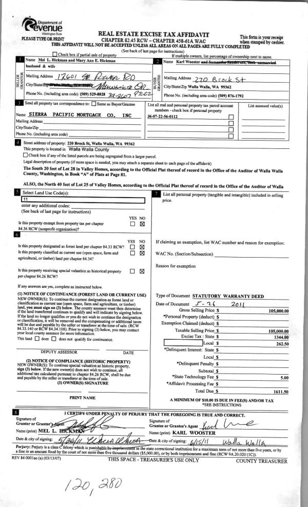 | 4 | 06/17/2011 | WARRANTY D | WARRANTY DEED | HICKMAN, MEL L & MARYANN | WOOSTER, KARL | | | $105,000.00 | 120280 | 2011-04730 |