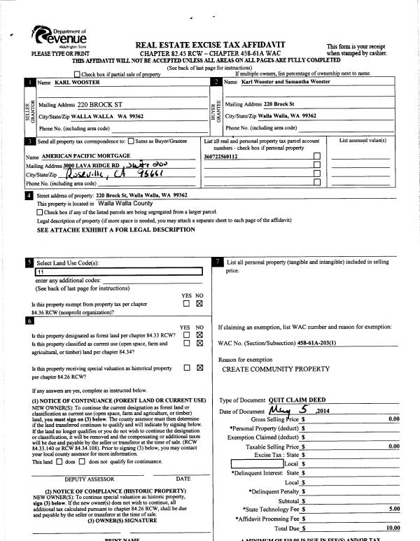 | 3 | 05/09/2014 | QCD | QUIT CLAIM DEED | WOOSTER KARL | WOOSTER KARL & SAMANTHA | | | | 125864 | 2014-03190 |